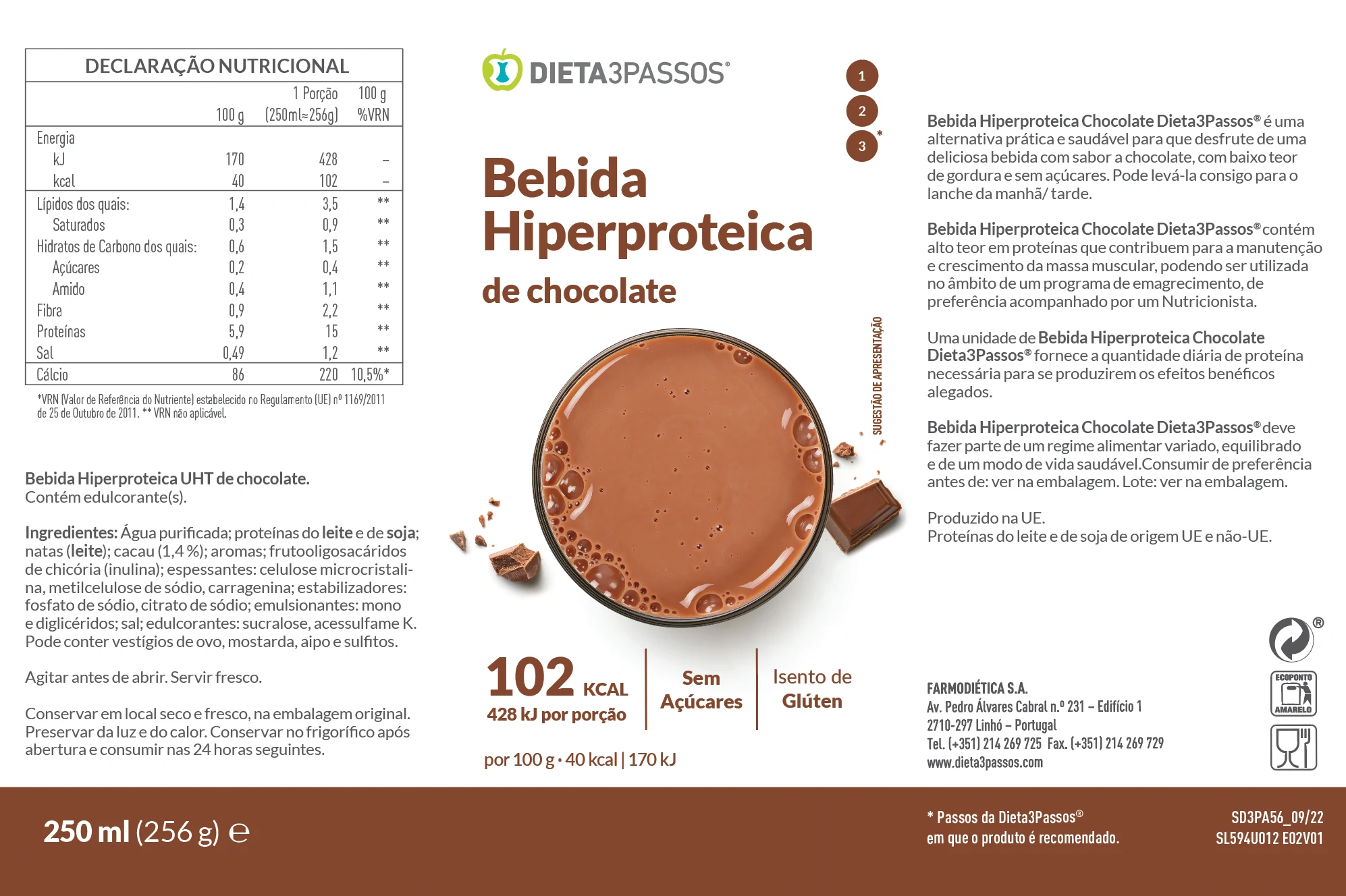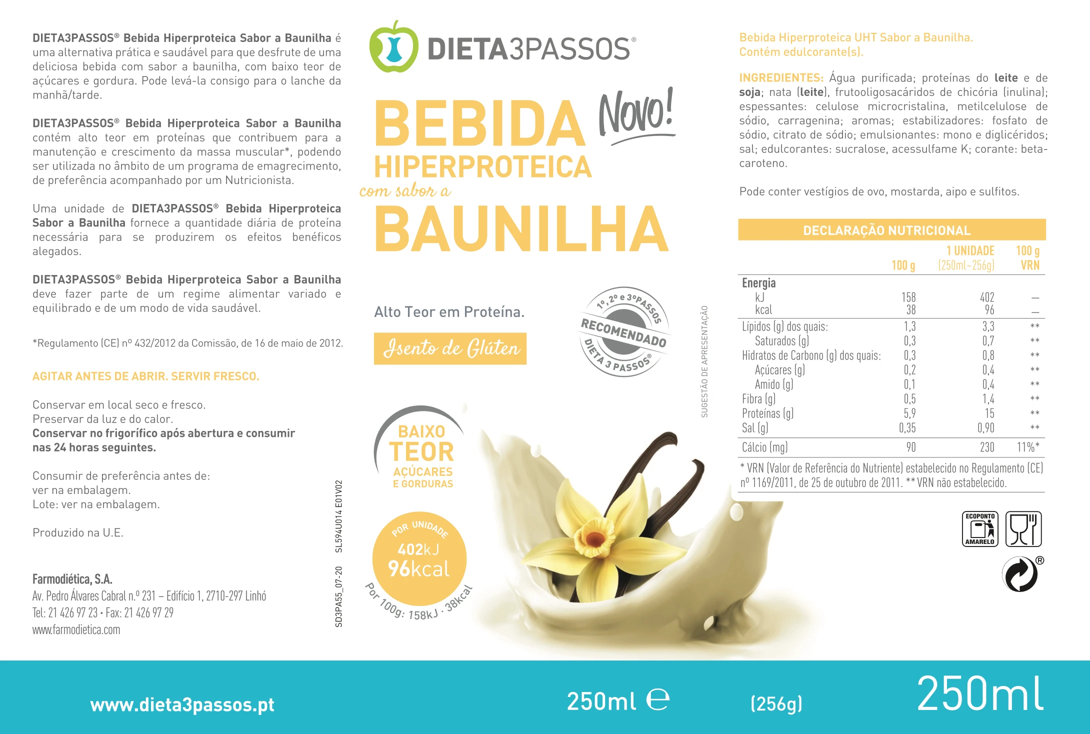 As Bebidas Hiperproteicas Dieta3Passos® são uma alternativa prática e saudável para que desfrute de uma deliciosa bebida com sabor a baunilha ou chocolate, com baixo teor de açúcares e gordura. Pode levá-las consigo para o lanche da manhã/tarde ou consumi-las como sobremesa ou ceia.