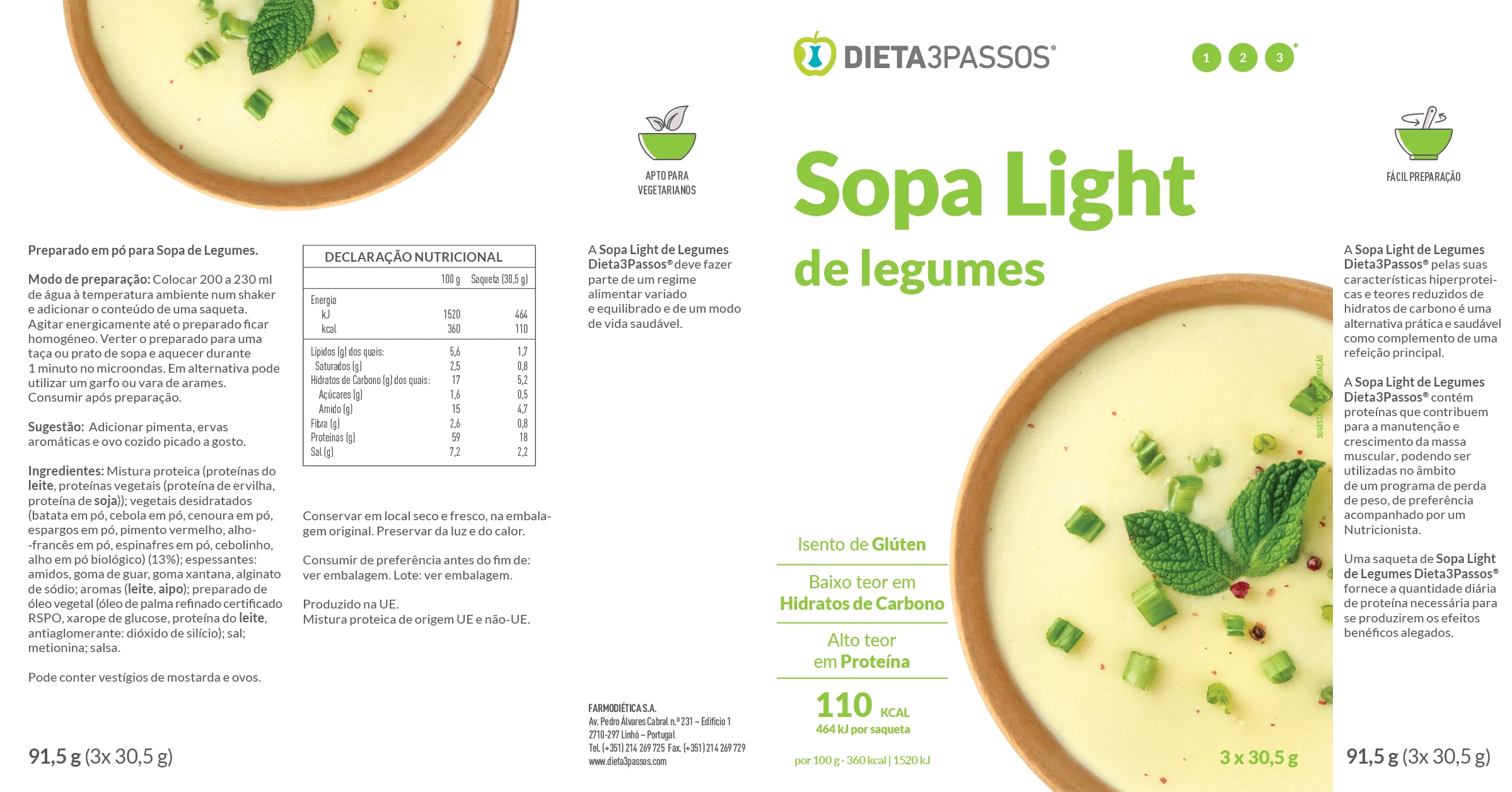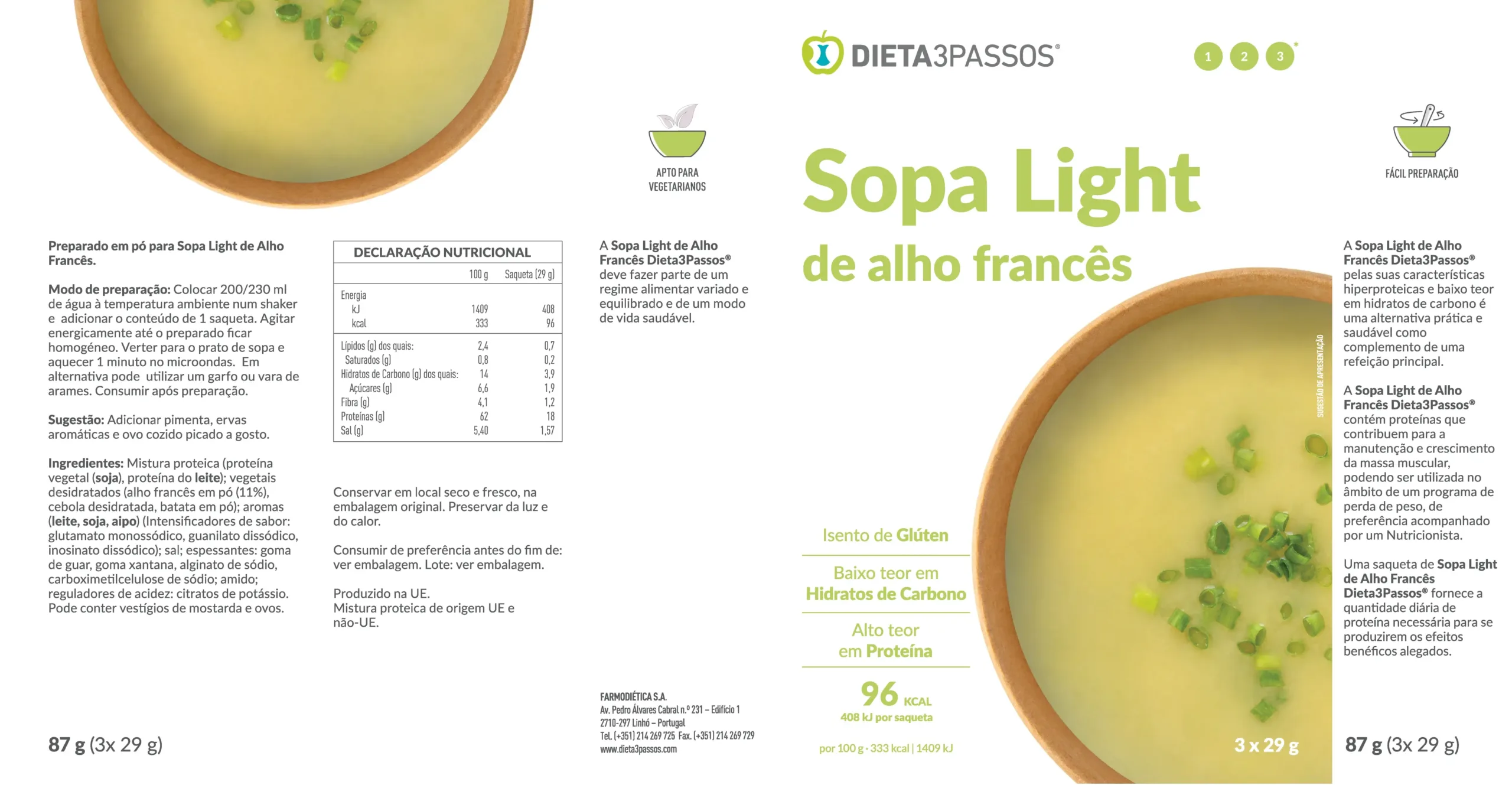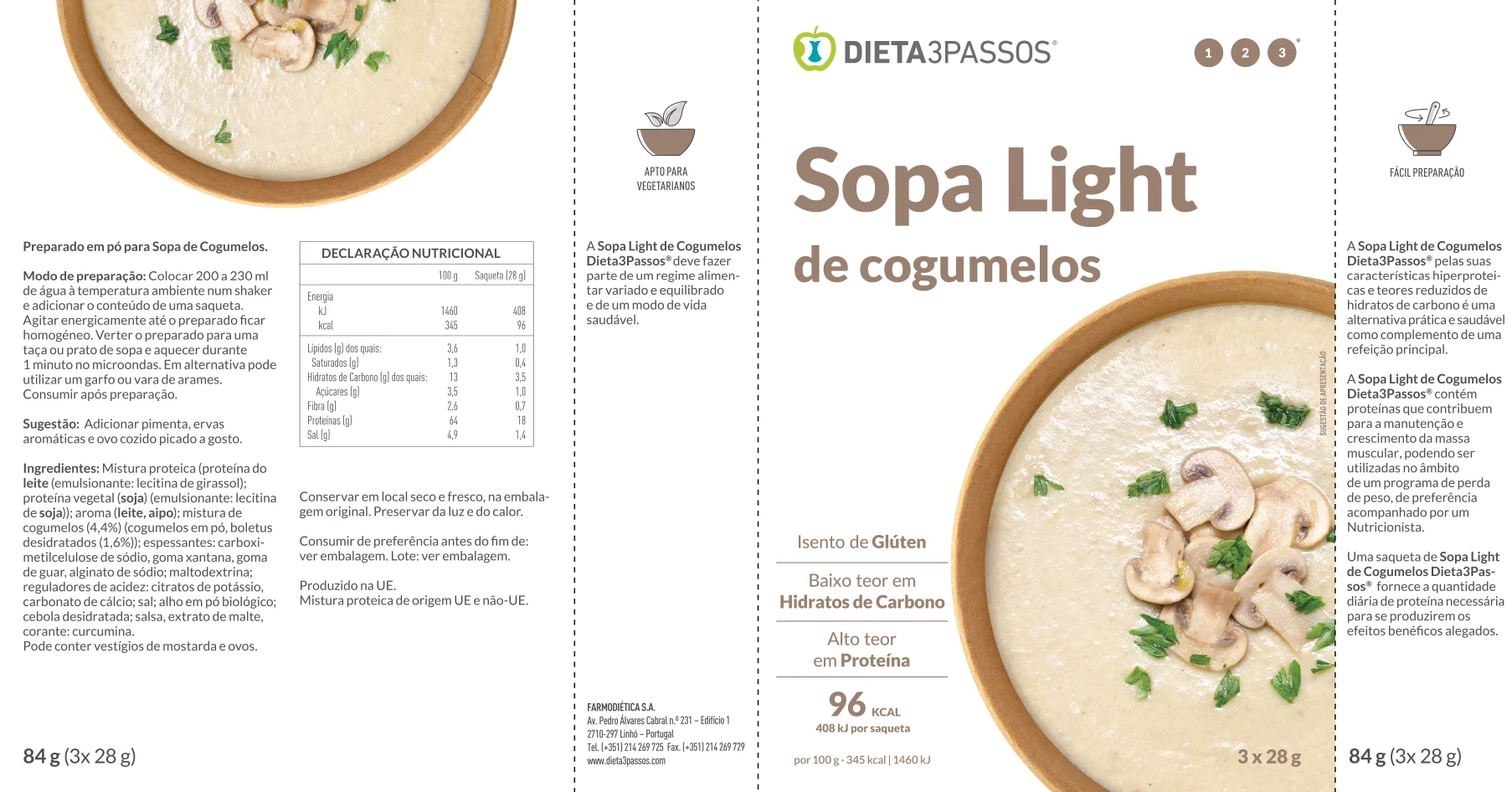 As Sopas Dieta3Passos® são nutritivas e com baixo teor de açúcares e gorduras. Pelas suas características hiperproteicas são uma ótima opção prática e saudável, como complemento de uma refeição principal ou substituto de refeição. Aproveite o sabor e a sensação reconfortante que estas sopas proporcionam.