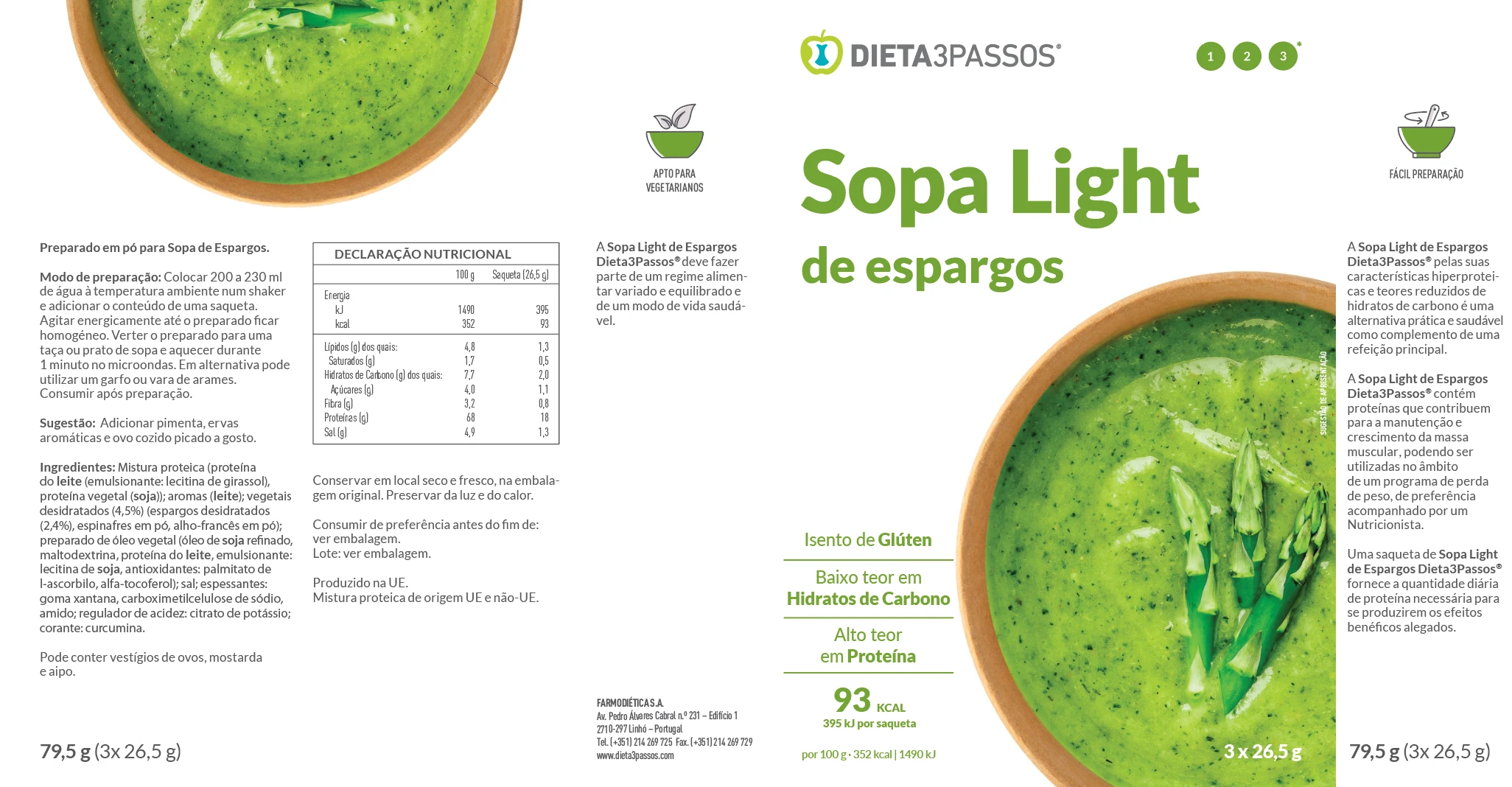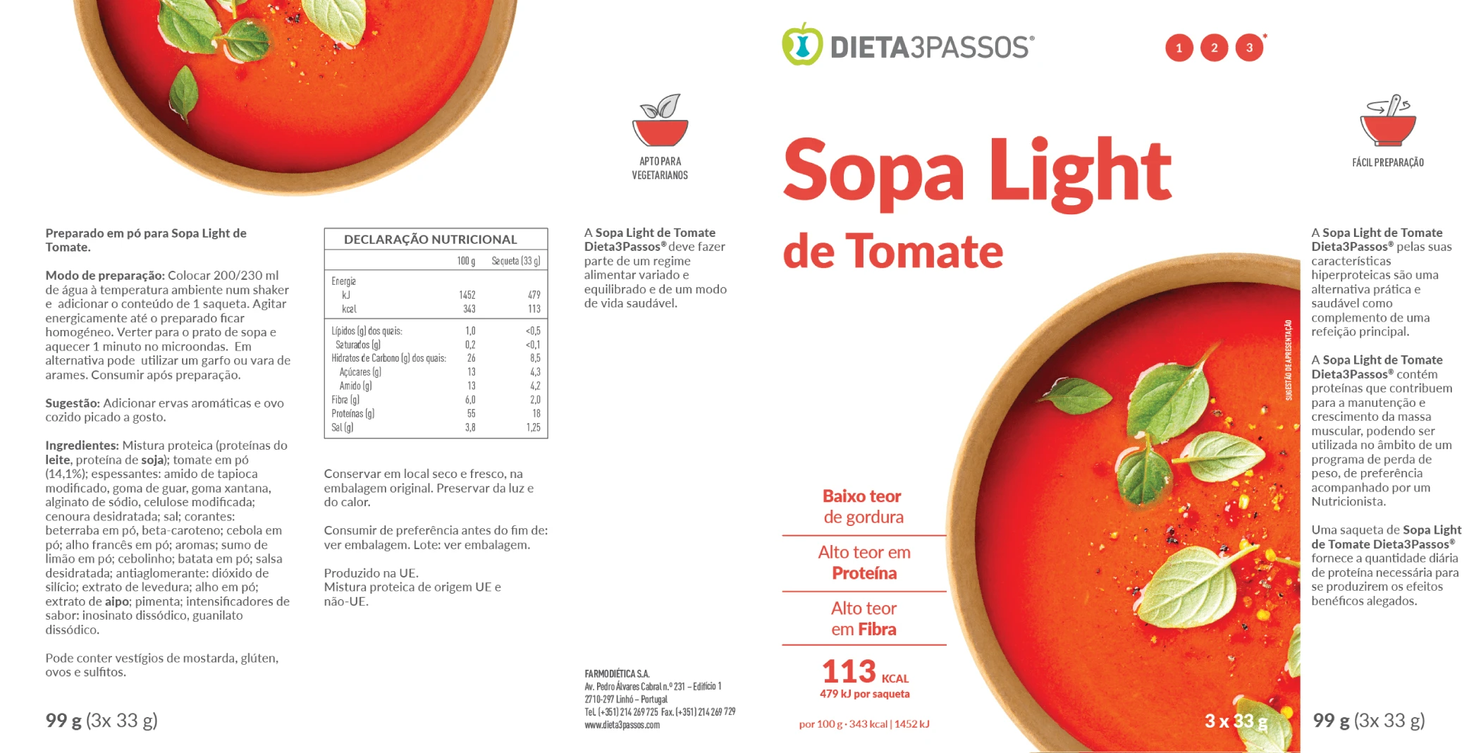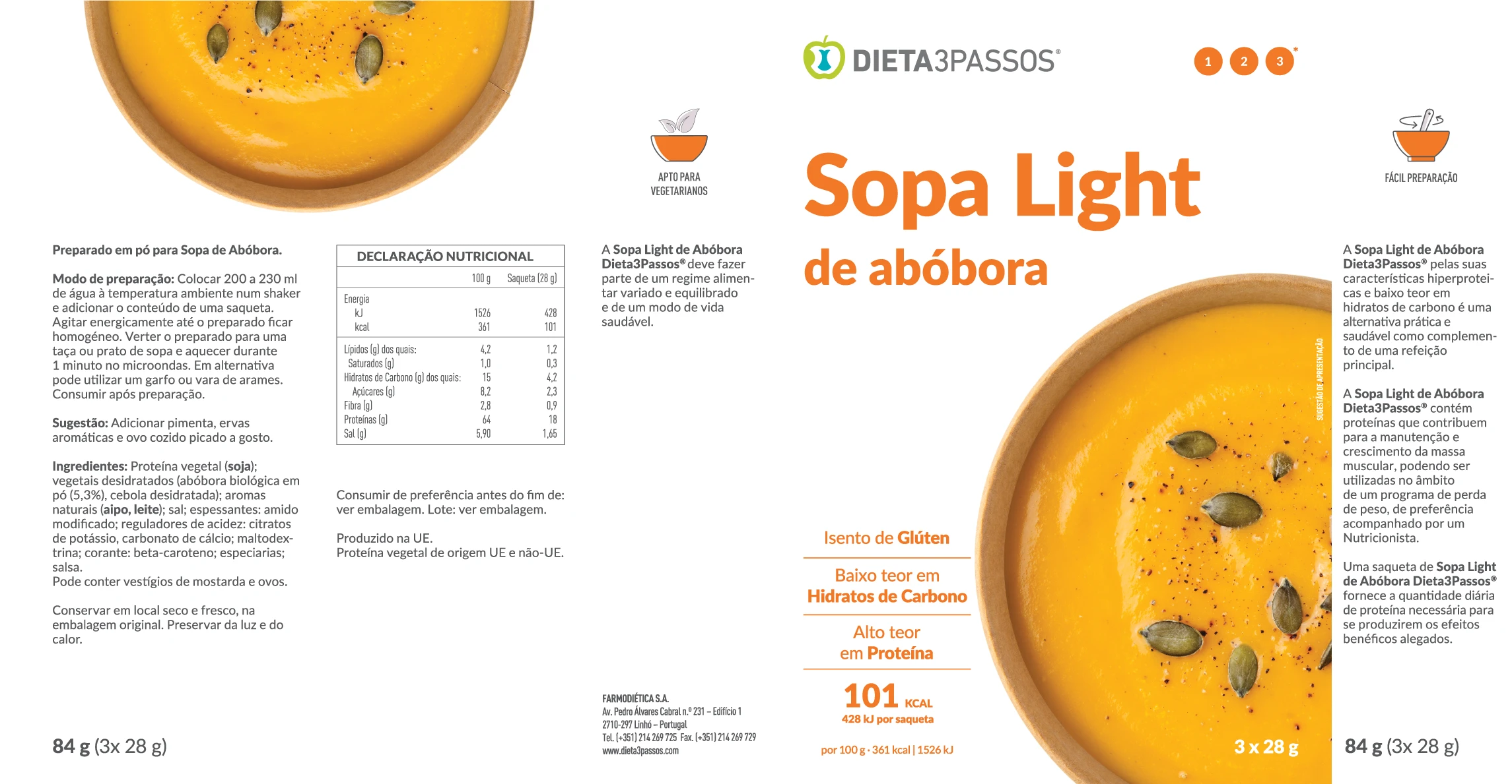 As Sopas Dieta3Passos® são nutritivas e com baixo teor de açúcares e gorduras. Pelas suas características hiperproteicas são uma ótima opção prática e saudável, como complemento de uma refeição principal ou substituto de refeição. Aproveite o sabor e a sensação reconfortante que estas sopas proporcionam.