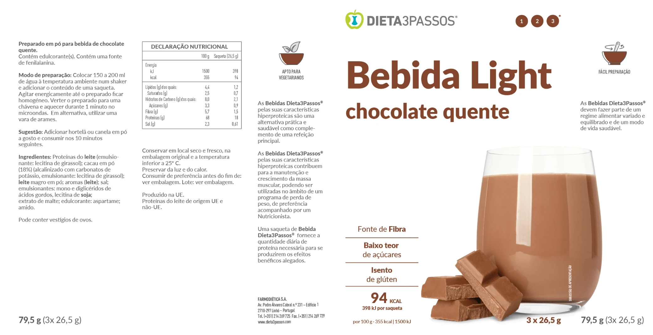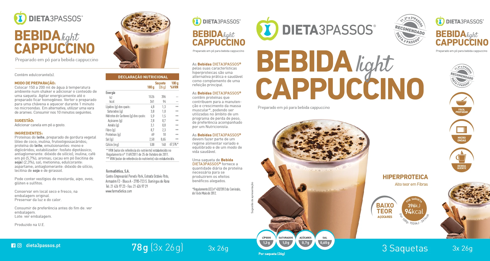 As Bebidas Dieta3Passos® pelas características hiperproteicas são uma alternativa prática e saudável ao pequena almoço ou ao lanche da manhã/tarde. Contém proteínas que contribuem para a manutenção e crescimento da massa muscular, podendo ser utilizadas no âmbito de um programa de perda de peso, de preferência acompanhado por um Nutricionista.