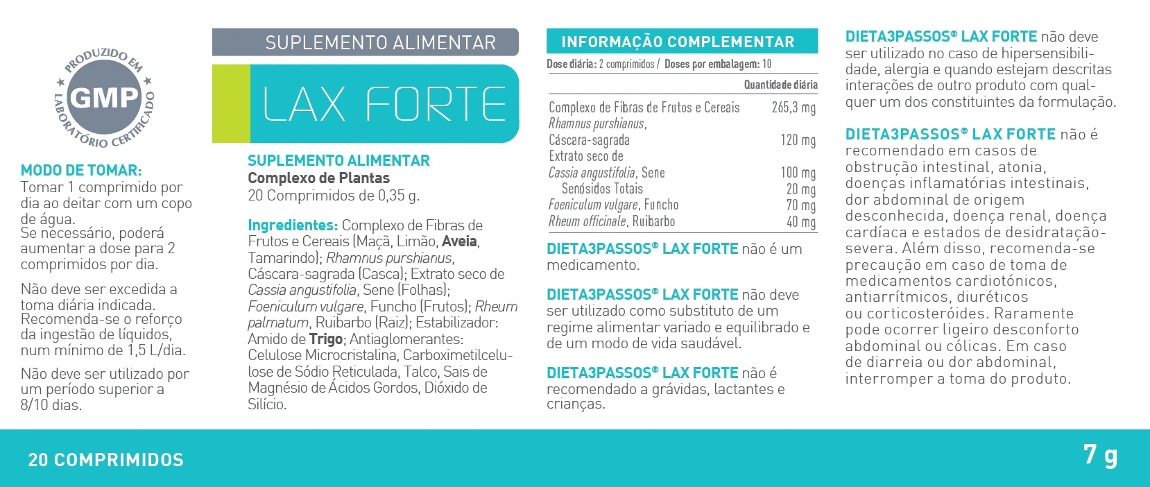 Dieta3Passos Lax Forte é um suplemento alimentar que contém na sua composição ingredientes como Cáscara-sagrada, Sene, Funcho, Ruibarbo e ainda um Complexo de Fibras de Frutos e Cereais.