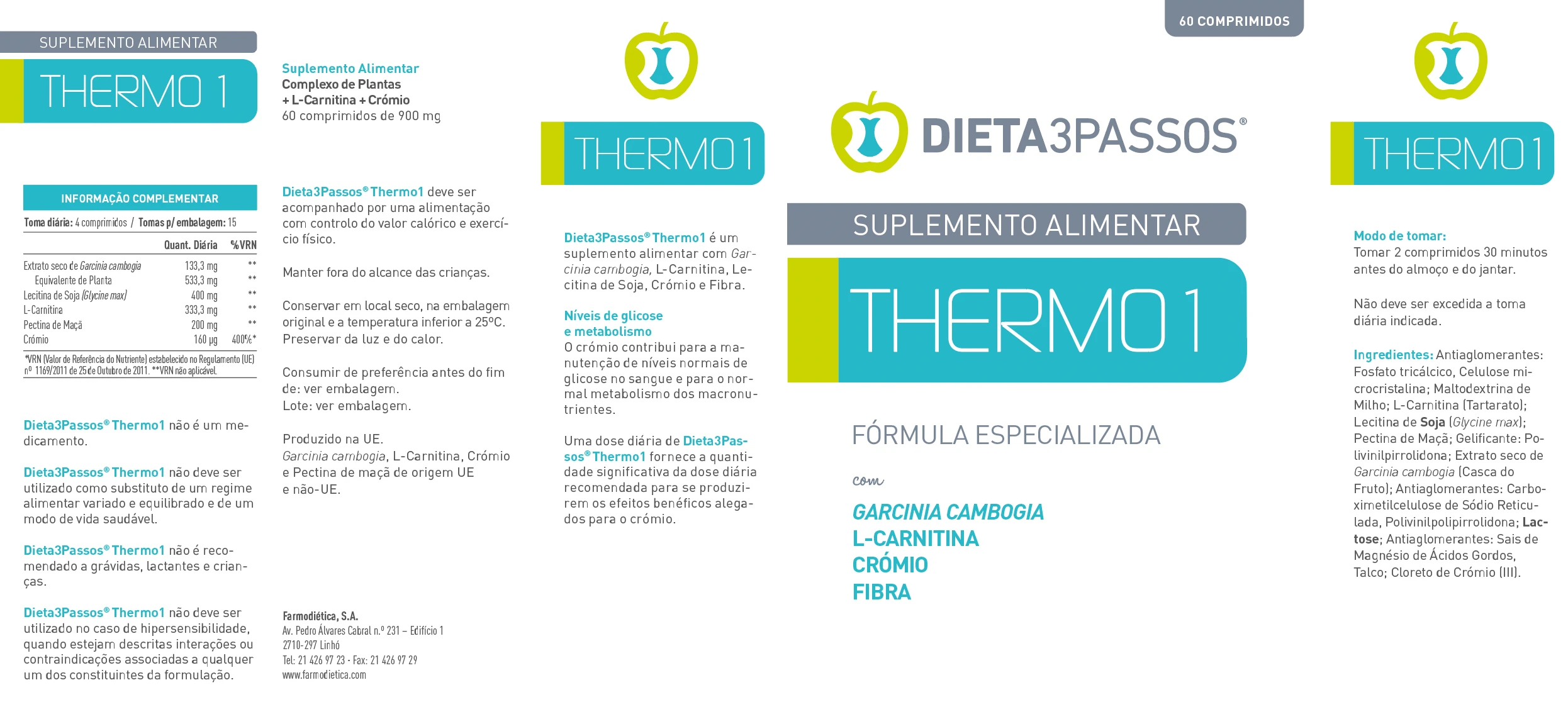 Dieta3Passos Thermo 1 é um suplemento alimentar com uma fórmula especializada com Garcinia cambogia, L-Carnitina, Lecitina de Soja, Crómio e Fibras. O crómio contribui para a manutenção de níveis normais de glicose no sangue e para o normal metabolismo dos macronutrientes.