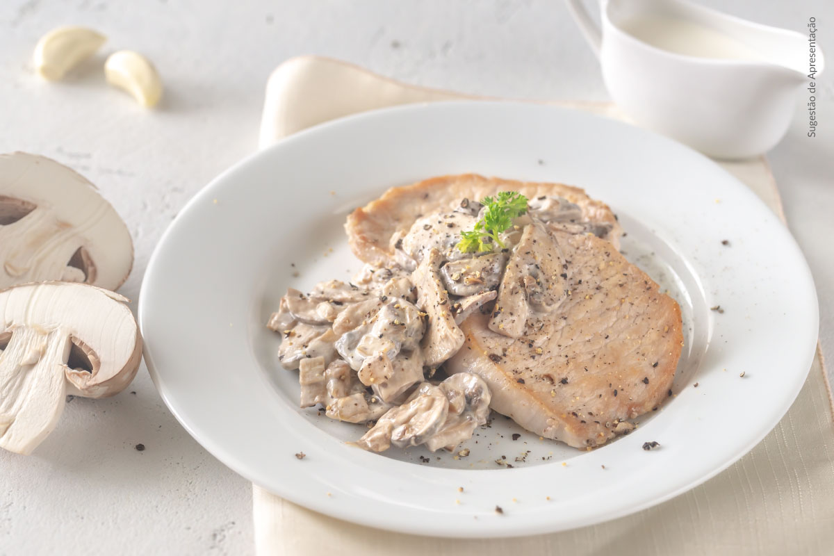 Comece por temperar as febras de porco com sal, pimenta, alho em pó e sumo de limão, e de seguida deixe a marinar durante algum tempo.