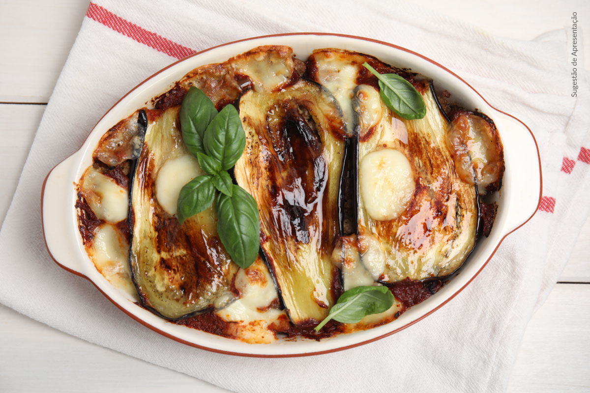 Num recipiente quadrado com 3 a 5 cm de altura disponha em camadas a beringela e a carne.