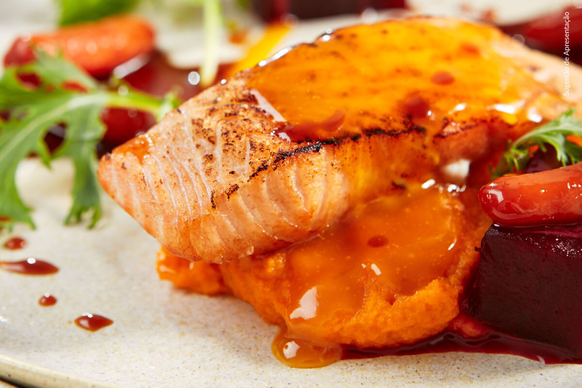 Retire os lombos de salmão do forno, coloque num prato e cubra com o molho de maracujá.