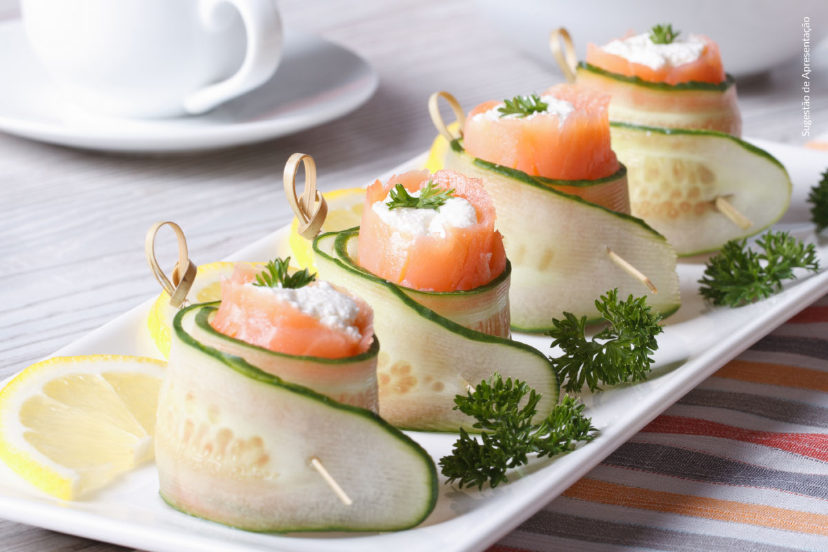 Barre as fatias de pepino com a mistura de queijo-creme e acrescente, em metade delas, o salmão e, noutra metade, o atum.