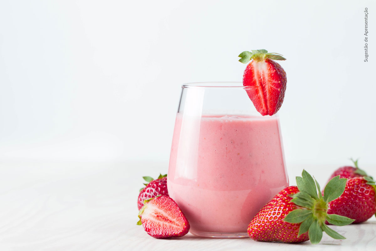 Triture cerca de metade dos morangos com o iogurte e reserve.