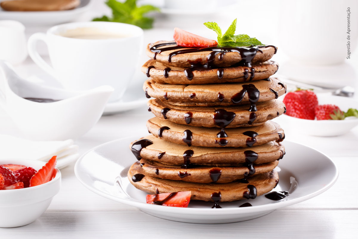 Barre a panqueca com o chocolate e adicione 2 morangos cortados em pedaços.