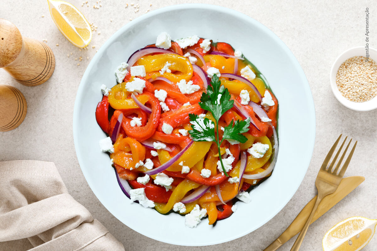 Por cima dos pimentos, coloque a cebola roxa cortada em meias luas e o queijo feta grosseiramente esfarelado. Tempere com pimenta a gosto e umas gotas de vinagre e polvilhe com salsa.
