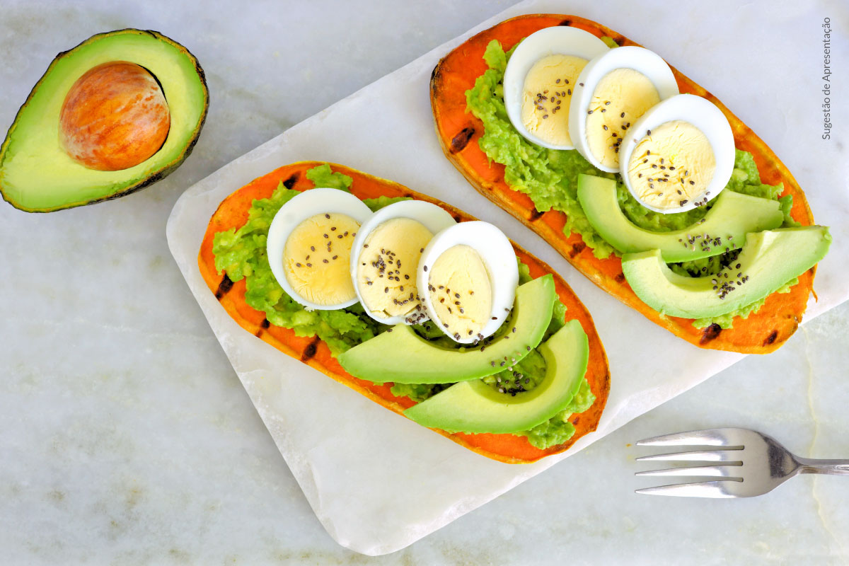 Espalhe o creme de abacate por cima da cada fatia, acrescente o ovo e termine salpicando com as sementes de chia.