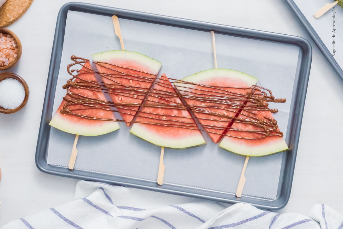 Comece por cortar a melancia em triângulos e coloque o pau de gelado na zona com casca.